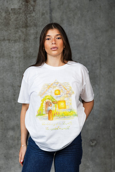 על חזית החולצה מתנוסס עיצוב עדין אך עוצמתי בהשראת הפסוק "חכמות נשים בנתה ביתה". בית אבן מואר, חמים ומזמין, ניצב במרכז, כשעל שלט הדלת מופיעה הגימטריה 1748, חותם שמחבר בין מסורת עתיקה לבין אמירה מודרנית. העיצוב מסמל את היכולת הנשית לברוא עולמות, ליצור מציאות, ולהעניק תחושת בית אמיתי.