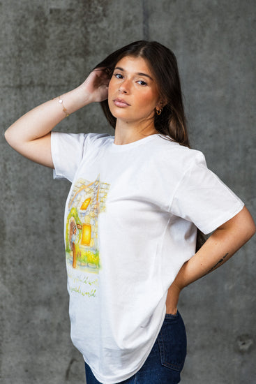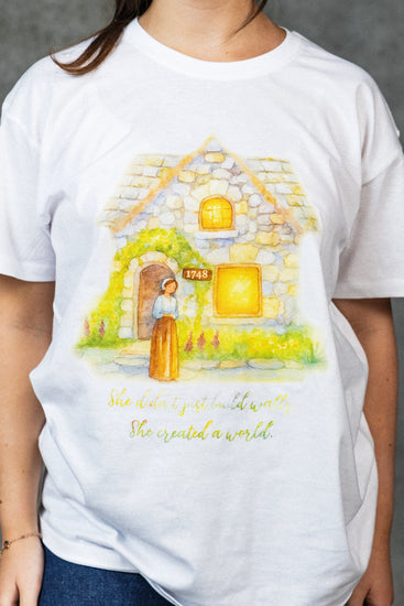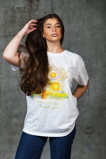 על חזית החולצה מתנוסס עיצוב עדין אך עוצמתי בהשראת הפסוק "חכמות נשים בנתה ביתה". בית אבן מואר, חמים ומזמין, ניצב במרכז, כשעל שלט הדלת מופיעה הגימטריה 1748, חותם שמחבר בין מסורת עתיקה לבין אמירה מודרנית. העיצוב מסמל את היכולת הנשית לברוא עולמות, ליצור מציאות, ולהעניק תחושת בית אמיתי.