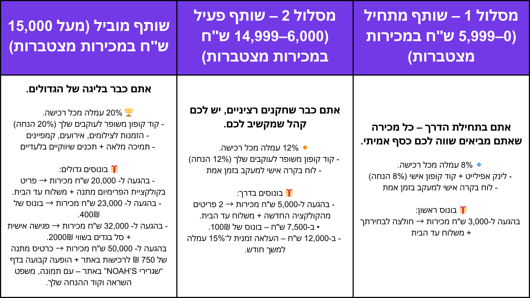 תוכנית שותפים (Affiliate) היא דרך להרוויח כסף על ידי שיתוף של לינק ייחודי שלך למותג שלנו. כל רכישה שתגיע דרכך – תזכה אותך בעמלה.
