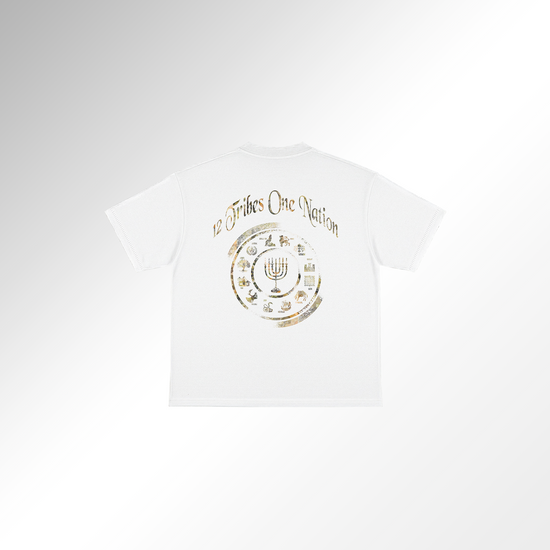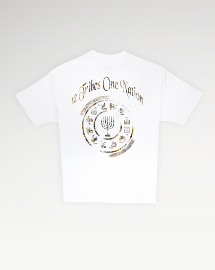 על גב החולצה מתנוסס עיצוב יוקרתי ומעורר השראה של 12 השבטים שורש העם היהודי, המקור והבסיס של כולנו. במרכז, המנורה הקדושה, כסמל של אור ואחדות, ומסביבה סמלי כל שבט ושבט. המסר ברור: לא משנה מאיפה באנו כולנו עם אחד, מחוברים לעבר, להווה ולעתיד משותף.