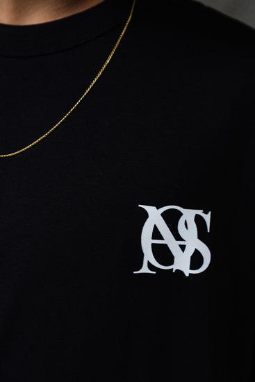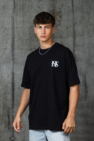 הדוגמן בחולצה שחורה לובש מידה M בגובה 1.70מ